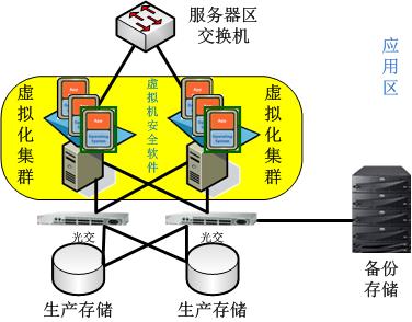 在应用区所有服务器上做虚拟化,配置物理资源、主机迁移策略。实现服务器负载和应用容灾的功能。后端数据存放在专业生产存储上,存储做双冗余。