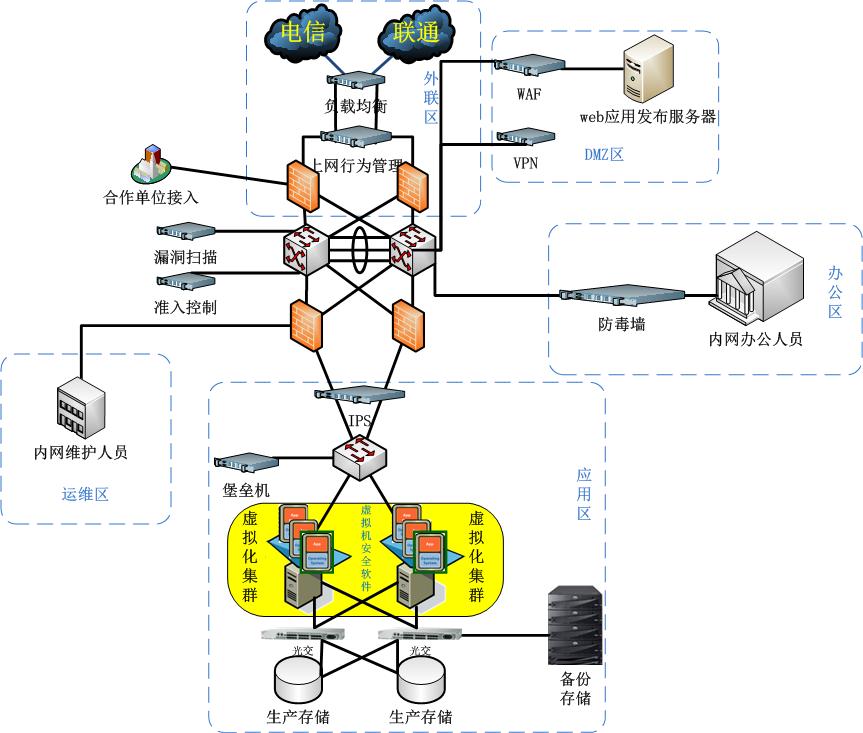 在运维区、应用区、外联区及合作单位接入边界均部署防火墙。配置访问控制策略、做流量控制、DDOS防御、内容过滤。